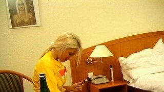 Blonde babe inserts bottle in her wet cunt