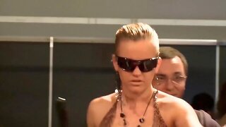 Hot skinny babe in a scandal lapdance porn show on public sexfair stage